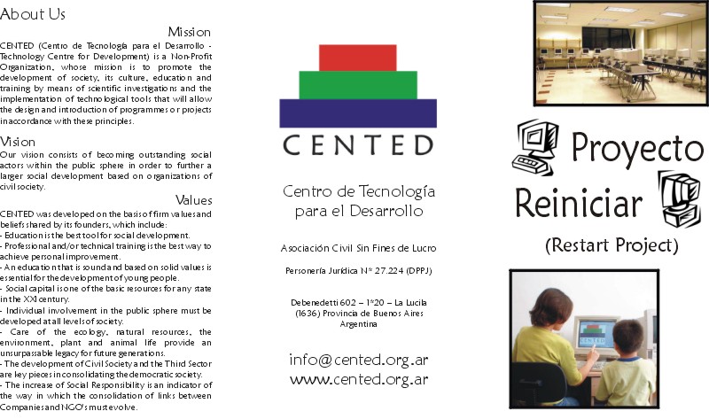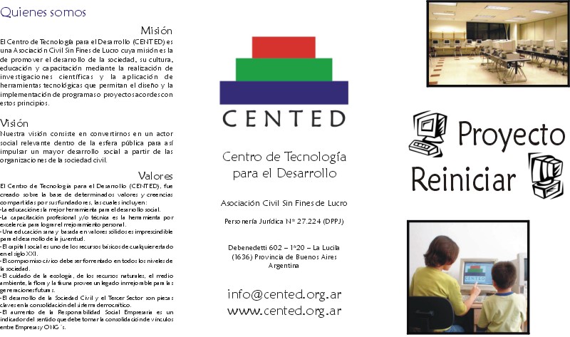 El Centro de Tecnología para el Desarrollo (CENTED) es una Asociación Civil Sin Fines de Lucro cuya misión es la de promover el desarrollo de la sociedad, su cultura, educación y capacitación mediante la realización de investigaciones científicas y la aplicación de herramientas tecnológicas que permitan el diseño y la implementación de programas o proyectos acordes con estos principios.