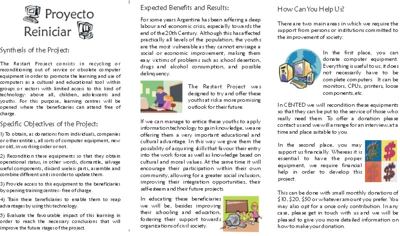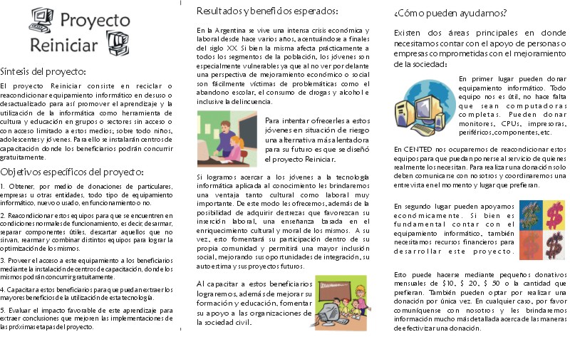 El proyecto Reiniciar consiste en reciclar o reacondicionar equipamiento informático en desuso o desactualizado para así promover el aprendizaje y la utilización de la informática como herramienta de cultura y educación en grupos o sectores sin acceso o con acceso limitado a estos medios; sobre todo adolescentes y jóvenes. Para ello se instalarán centros de capacitación donde los beneficiarios podrán concurrir gratuitamente.