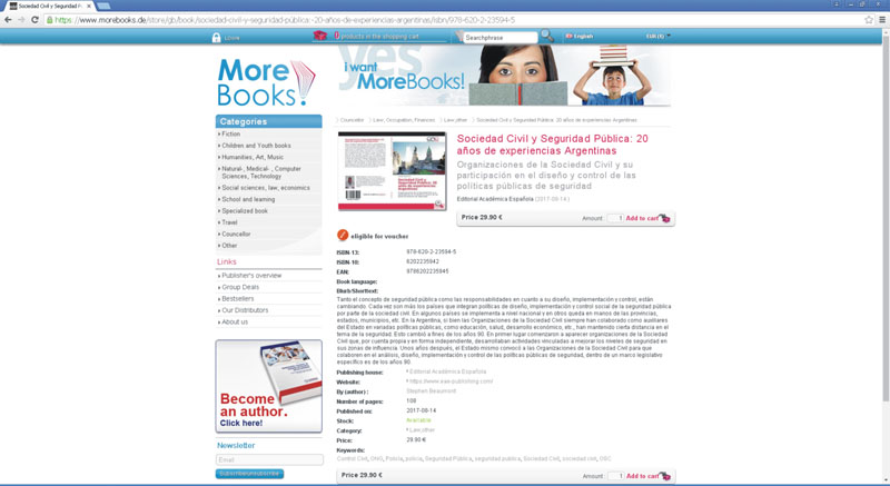 La Editorial Académica Española (integrante del grupo Alemán Omniscriptum Publishing) publicó el libro "Sociedad Civil y Seguridad Pública: 20 años de experiencias Argentinas"