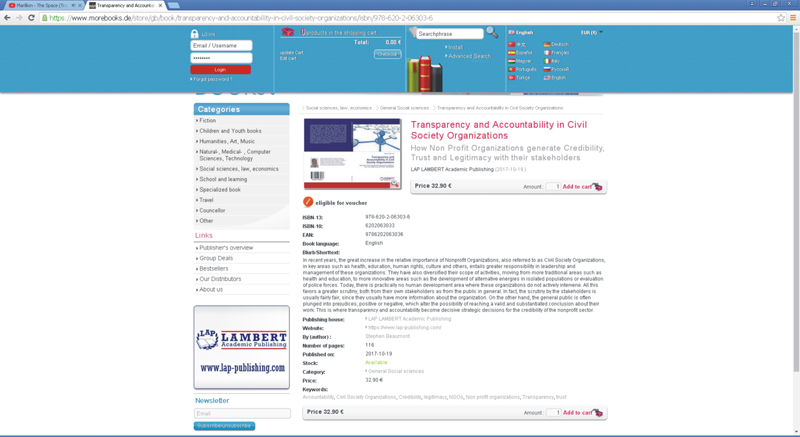 "Transparency and Accountability in Civil Society Organizations" ("Transparencia y Rendición de Cuentas en Organizaciones de la Sociedad Civil"), es el título del nuevo libro del Dr. Stephen Beaumont, publicado por Lambert Academic Publishing (integrante del grupo Alemán Omniscriptum Publishing).